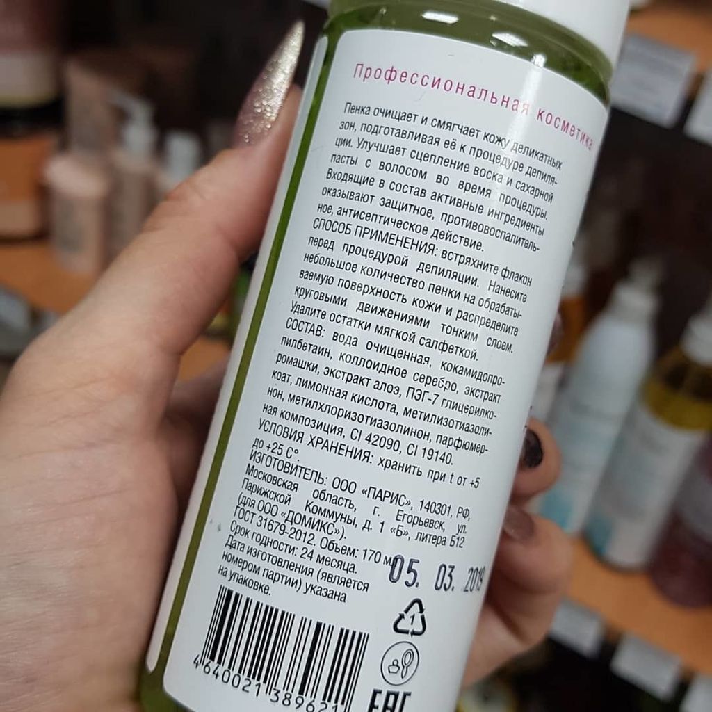 Способ применения: перед процедурой депиляции нанесите небольшое количество пенки на обрабатываемую поверхность кожи, распределите круговыми движениями тонким слоем. Удалите остатки мягкой салфеткой.