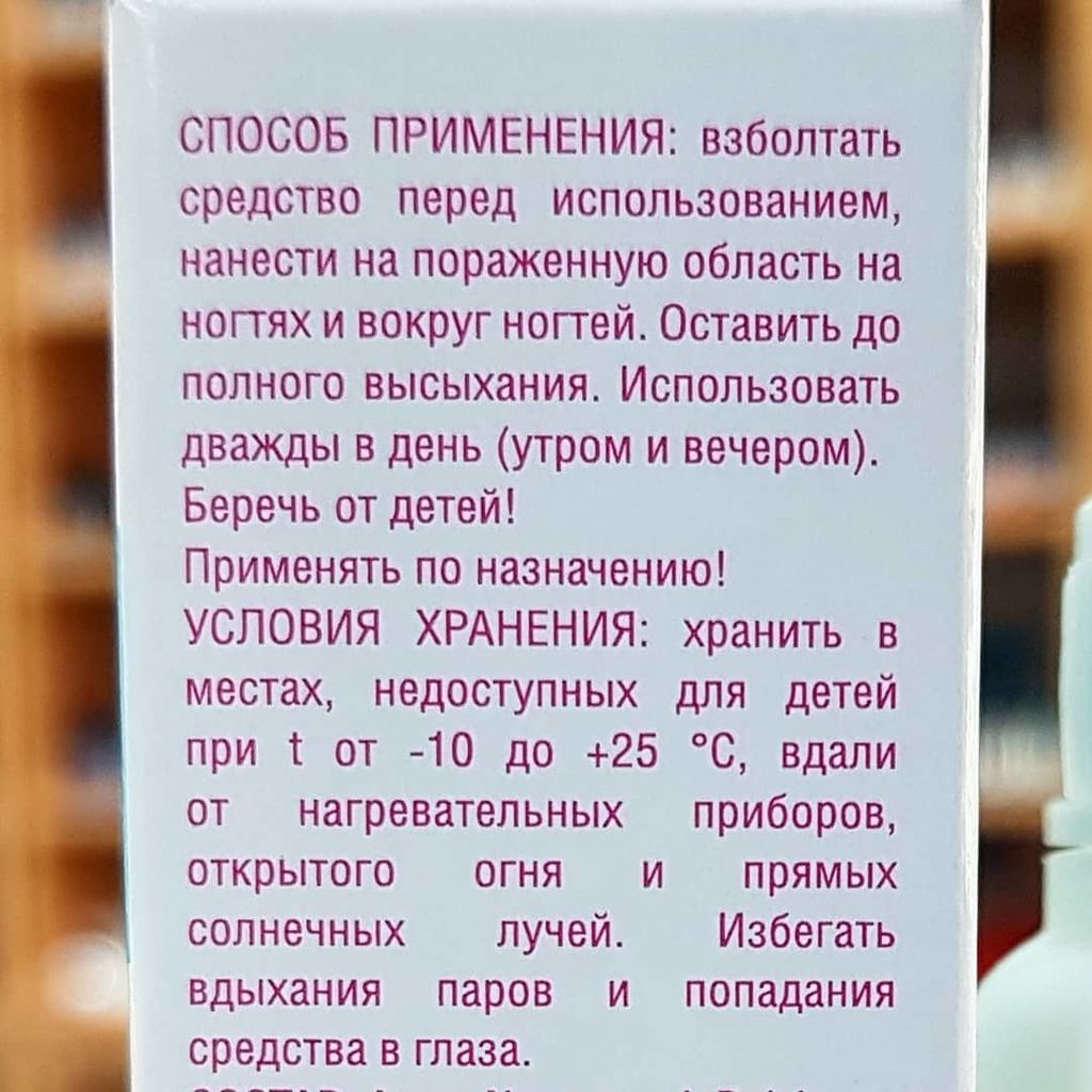 Перед применением средство необходимо взболтать, после нанести на пораженную область на ногтях и вокруг ногтей. Оставить до полного высыхания. Использовать дважды в день (утром и вечером).