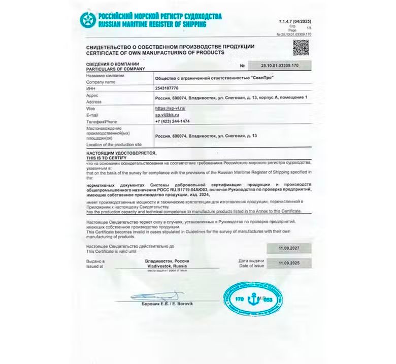 Деятельность компании "СеалПро" полностью соответствует требованиям Российского морского регистра судоходства, указанным в нормативных документах Системы добровольной сертификации продукции и производств общепромышленного назначения. Наша компания получила свидетельство о собственном производстве продукции, успешно прошла проверку и продлила свидетельство о соответствии производства требованиям морского регистра!