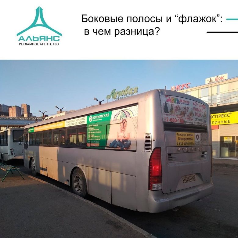 Флажок за счет использования боковых стекол позволяет добавить к информации изображение. Учтите, что боковые стекла печатаются на перфорированной пленке, она слегка “съедает” яркость изображения. Рекомендуем от 3 автобусов для минимально эффективного охвата.