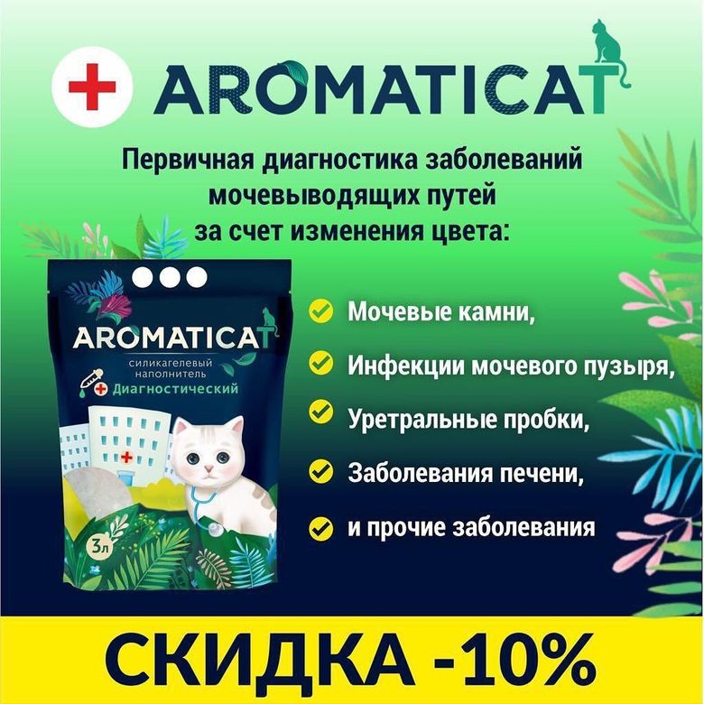 Отследить первые звоночки о плохом самочувствии любой кошки вам поможет силикагелевый диагностический наполнитель для кошачьего туалета AROMATICAT. Принцип действия очень прост - гель меняет цвет, если у животного есть заболевания мочевыводящих путей.