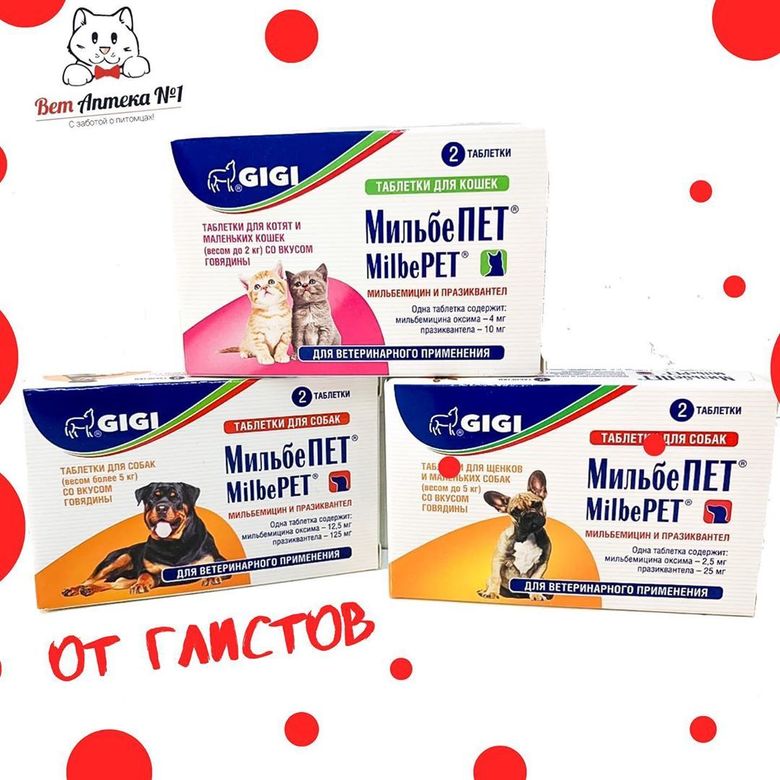 Таблетки от глистов МильбеПет - новинка от известного европейского бренда GiGi. Комплексный противопаразитарный препарат направлен на лечение и профилактику основных видов нематод и цестод, а также смешаннх инвазий. Основные действующие вещества таблеток - мильбемицина оксим и празиквантел, поэтому МильбеПет является полным аналогом Мильбемакса и Милпразона по составу. Такая комбинация двух активных компонентов выбрана неслучайно. Согласно многолетним клиническим испытаниям