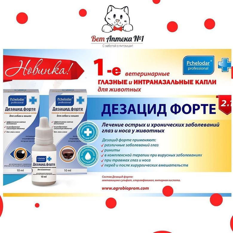 Заметили, что у питомца краснеют или слезятся глаза? Тогда Вам нужно эффективное средство с антибактериальным, противовоспалительным и регенерирующим эффектами. Противомикробные капли для глаз "Дезацид" при закапывании в конъюнктивальную полость быстро нормализуют состояние слизистой.