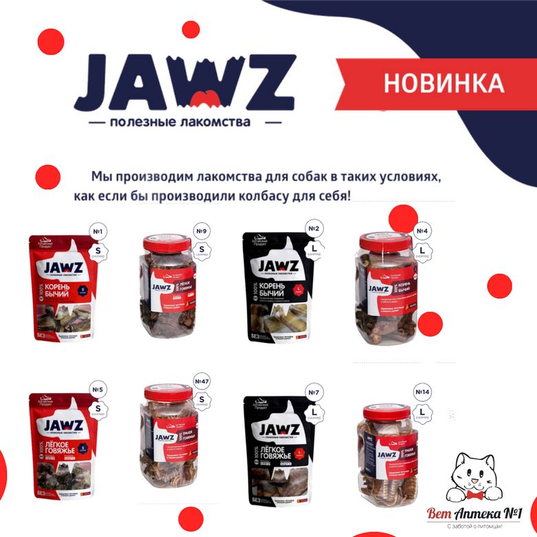 Компоненты корма JAWZ представлены в нескольких размерах: S и M, L и XL. Поэтому владельцы собак легко смогут подобрать для своих питомцев оптимальный вариант угощения не только по вкусовым или питательным свойствам, но и в зависимости от размера челюстей своих питомцев.