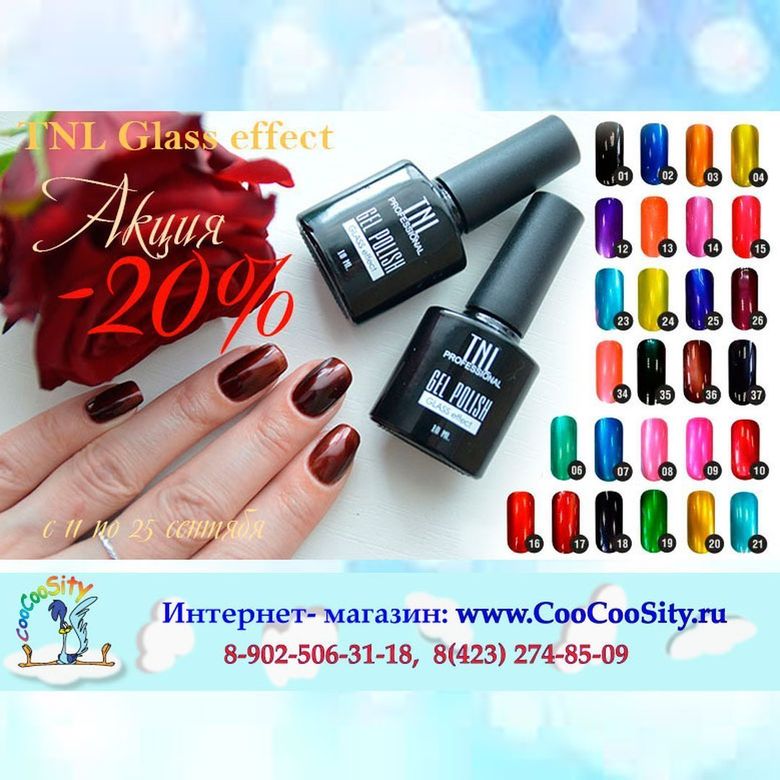 Также спешим сообщить, что у вас есть прекрасная возможность выгодно приобрести продукцию марки TNL – с 30% скидкой! Краски акриловые, жидкости для снятия акрила, пилки, средства для обезжиривания ногтевой пластины, крема, масла, топы, базы и многое другое. А на классическую палитру гель-лаков TNL действует скидка в 20%.