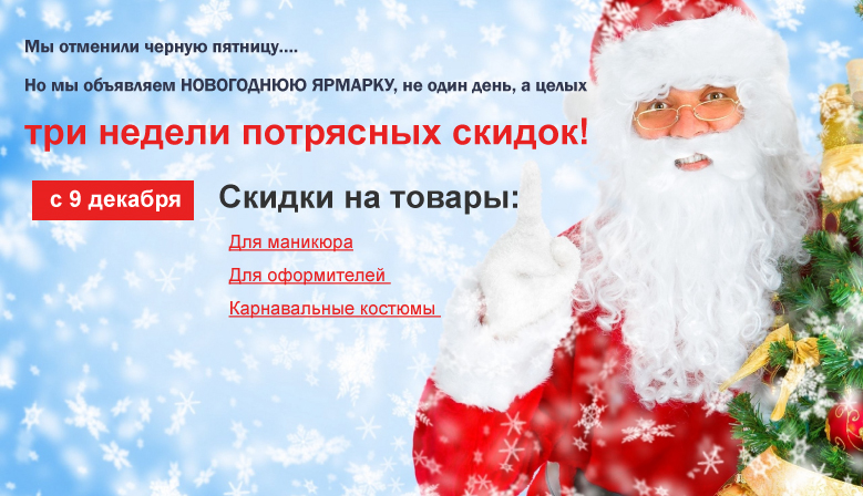Мы отменили черную пятницу, но! С 9 по 31 декабря мы устраиваем предновогоднюю ярмарку на нашем сайте! Целых три недели вас ждут скидки до 45% на товары из всех разделов нашего сайта: всё для маникюра, расходники для салонов красоты, карнавальные аксессуары, воздушные шары.