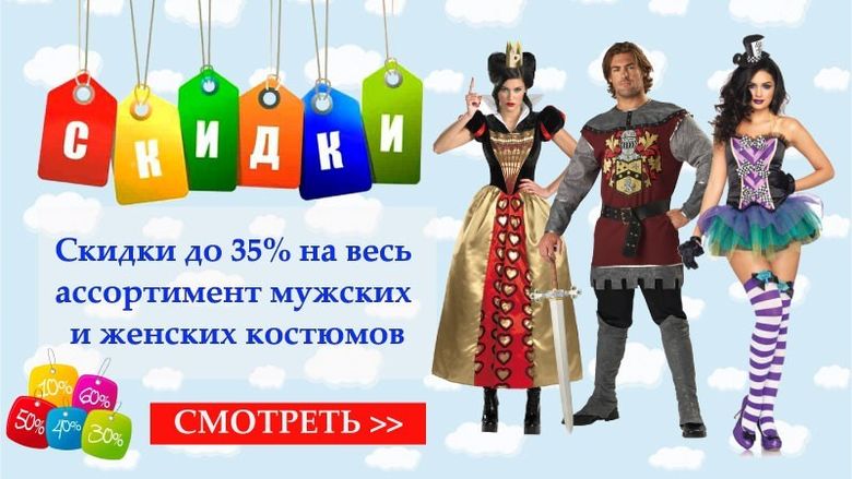 В наличии карнавальные костюмы со скидками от 15 до 20%. Можно найти варианты стоимостью от 1 000 до 2 500 рублей и выглядите неотразимо на любой костюмированной вечеринке!