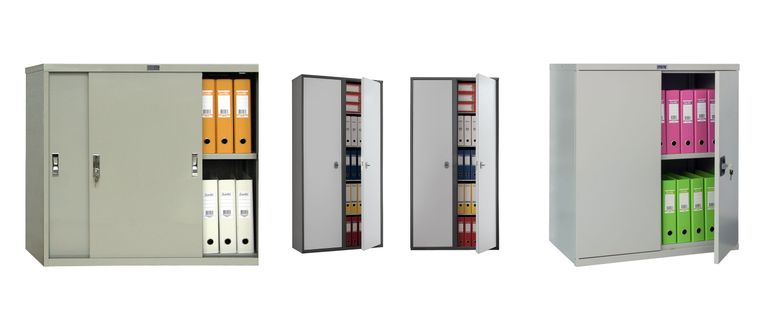 Также доступен классический вариант шкафа для офиса и архива — шкаф для хранения с распашными дверьми. В зависимости от уровня доступа к конфиденциальной информации, можно подобрать односекционный шкаф с одним или двумя замками или конструкцию с отдельным замком для каждой полки.