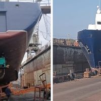 Фото 1: Монтаж винто-рулевого комплекса. Фото 2: Судно ППС-819 выведено из дока.