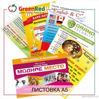 - А5, 130 гр./м2, двухсторонняя полноцветная печать — 3,6 рубля штука.