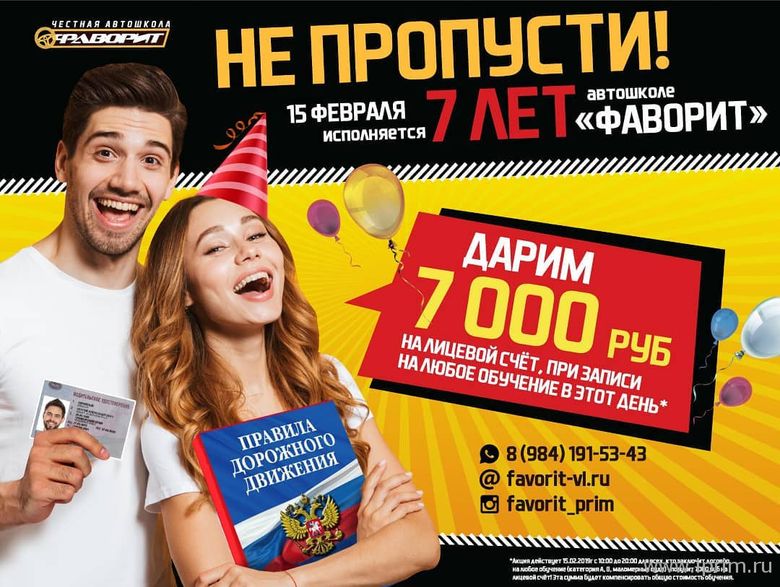 15 февраля нашей автошколе исполняется 7 лет. Ура! Однако подарки будем дарить мы вам (а не наоборот). Запланируйте приехать в пятницу к нам в офис - на Калинина 45 а или на Анны Щетининой, 3 и записаться на курсы вождения. Мы, в свою очередь, подарим вам 7000 рублей и положим их на счет. Так, вместо 20 000 рублей за категорию "В", вы потратите только 13 000 рублей. Записываться можно на любую категорию, мы дарим подарки всем абсолютно, и тем, кто хочет научиться водить катер, и тем, кто планирует водить грузовик и даже автобус.