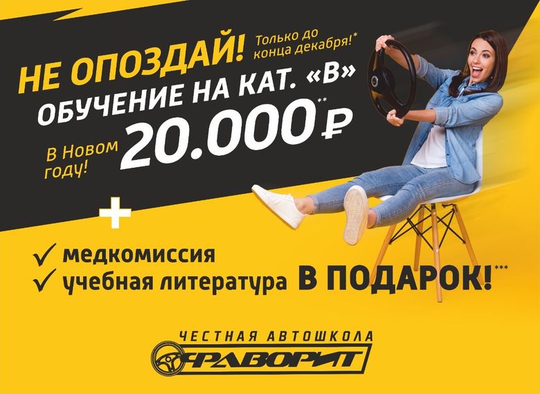 При оформлении договора на подарочный сертификат до 30 декабря 2020 года с единовременной оплатой за обучение мы дарим комплект учебной литературы и прохождение медицинской комиссии на право управления ТС категории "В" (при наличии справок-заключений от психиатра и нарколога).