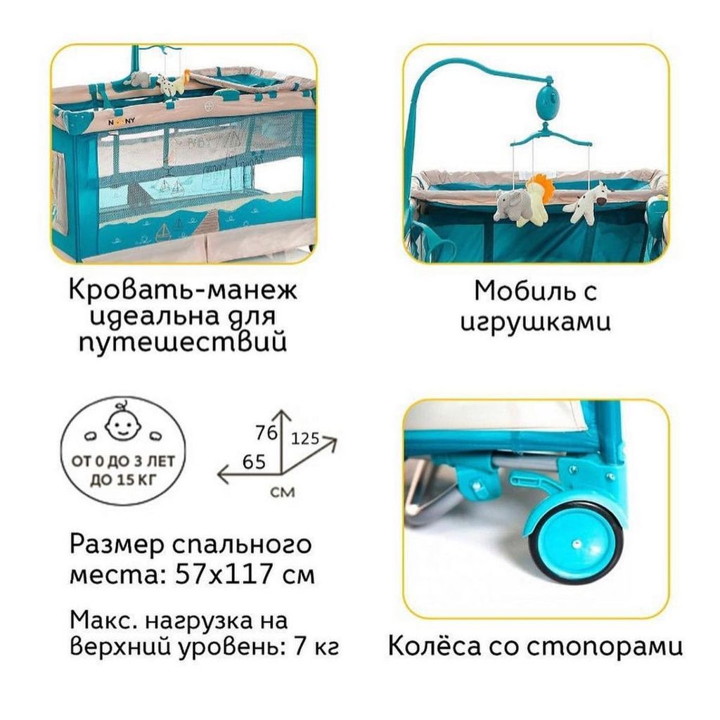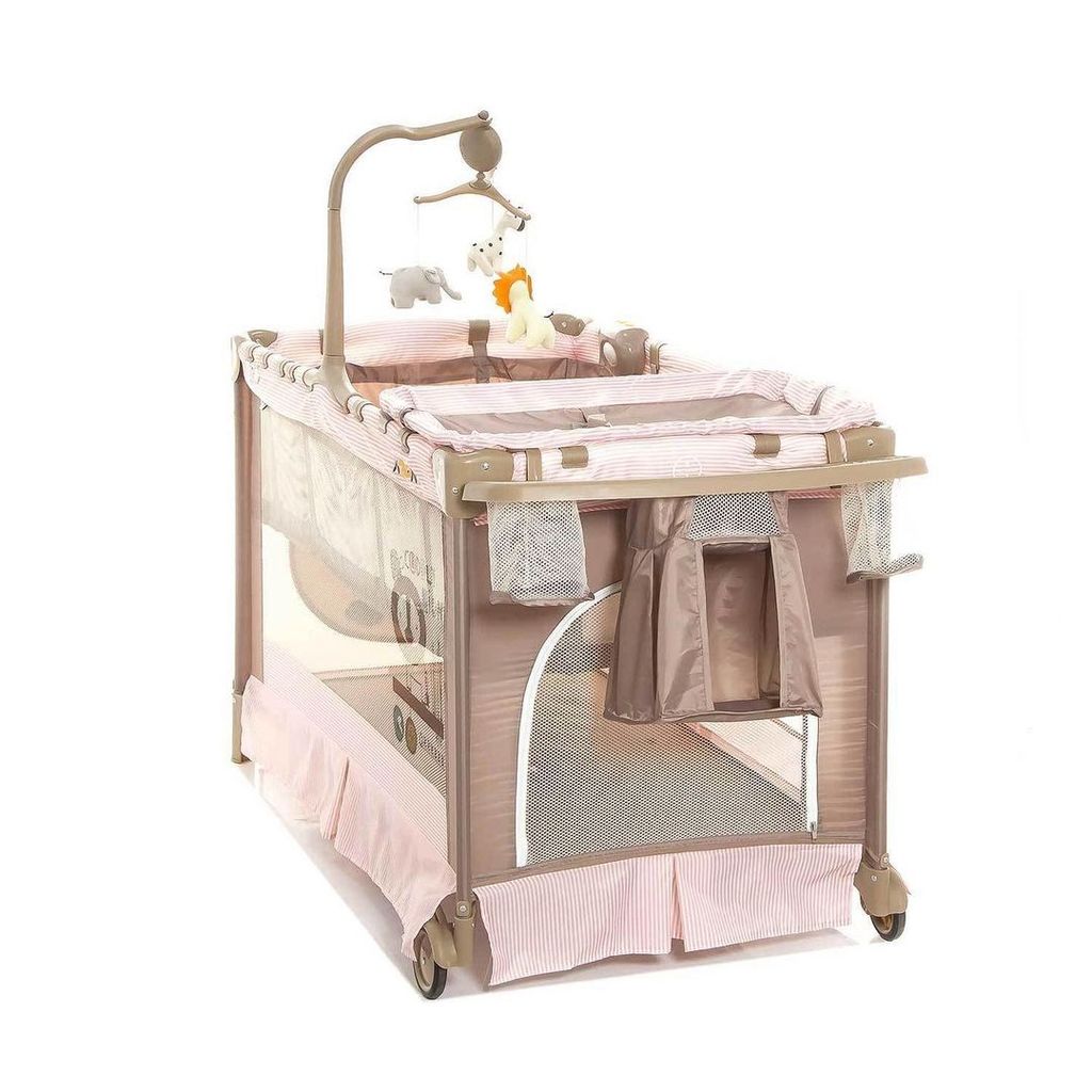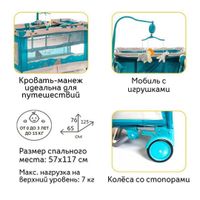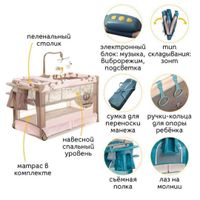 Съемный столик для пеленания пригодится в первые месяцы жизни ребенка. Сбоку имеется удобный кармашек на резинке. Манеж оснащен музыкальным мобилем с игрушками, навесным блоком с подсветкой, музыкой и вибрацией, хватательными кольцами для малыша, двумя колесами со стопорами для облегчения перемещения, полозьями для укачивания и лазом на молнии.