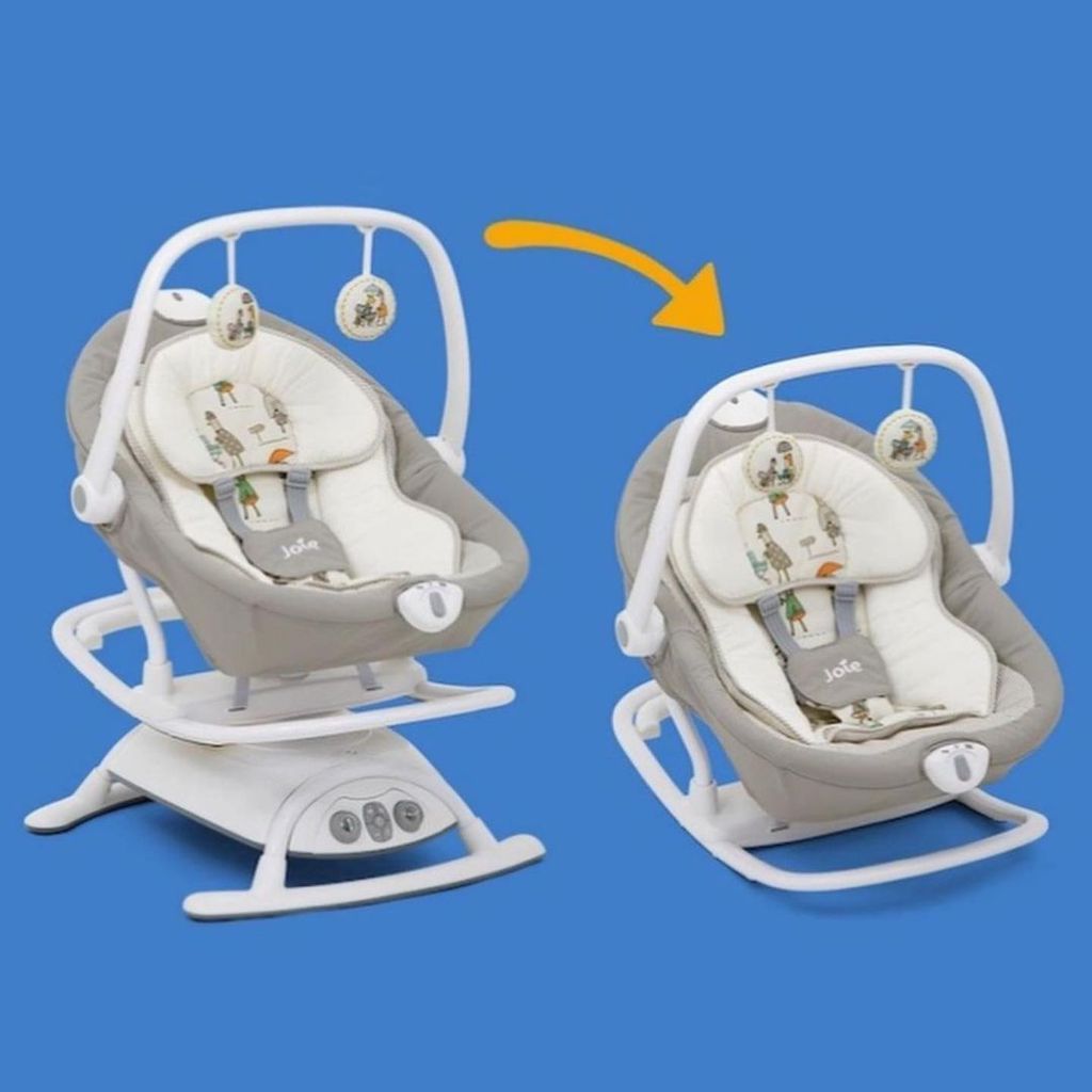 В наличии в магазине "Ляльки-Люльки" появились электронные качели Joie Sansa 2 в 1, совмещающие в себе укачивающую младенца люльку-качалку и съемный шезлонг для отдыха или кормления.