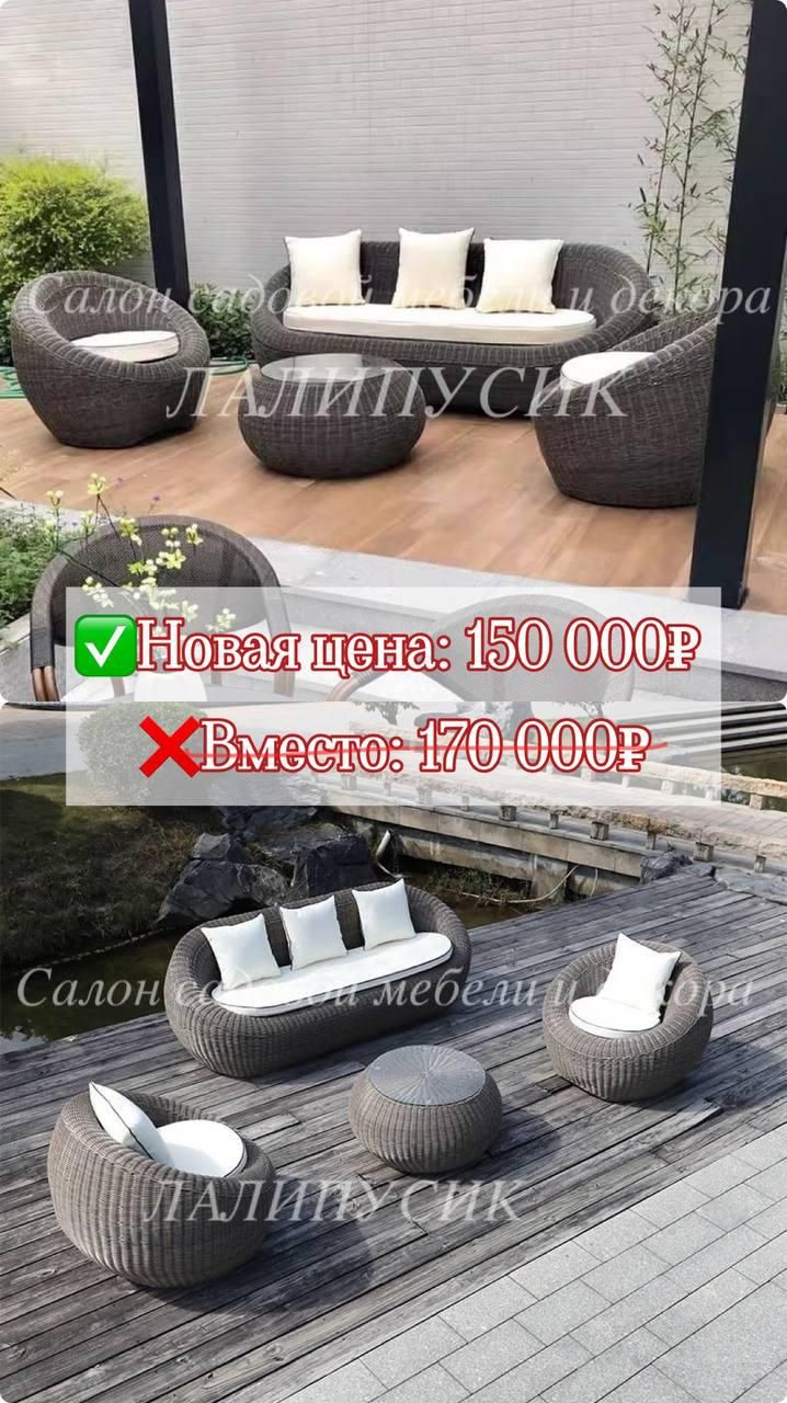 Салон садовой мебели и декора "Лалипусик" объявляет акцию "Пустой зал"! Подготавливая свое пространство к Новому 2026 году красной огненной лошади, мы предлагаем пять шикарных комплектов садовой мебели по суперцене! Не упустите шанс украсить террасу или двор с выгодой! Разные габариты, стили и формы, в разных цветовых решениях — подберите идеальный комплект-трансформер уличной плетеной мебели именно для вашего двора, террасы или балкона!