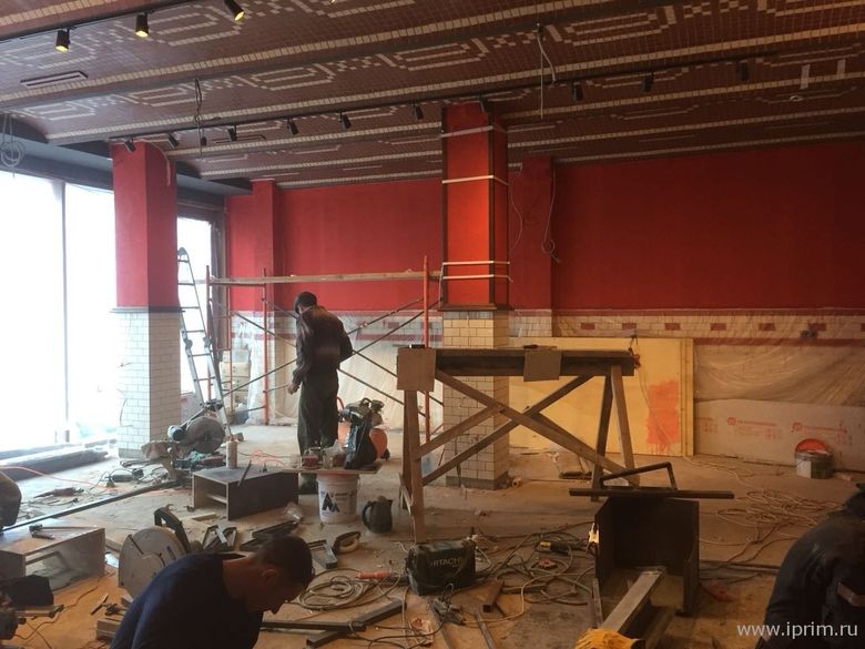 Для примера хотим показать вам несколько фотографий с ресторана "Хлопок" (на первой речке). В настоящее время специалисты нашей компании осуществляют внутреннюю отделку этого помещения по дизайн проекту. В оформлении ресторана используется декоративная штукатурка, которая наносится в стиле арт-бетон: