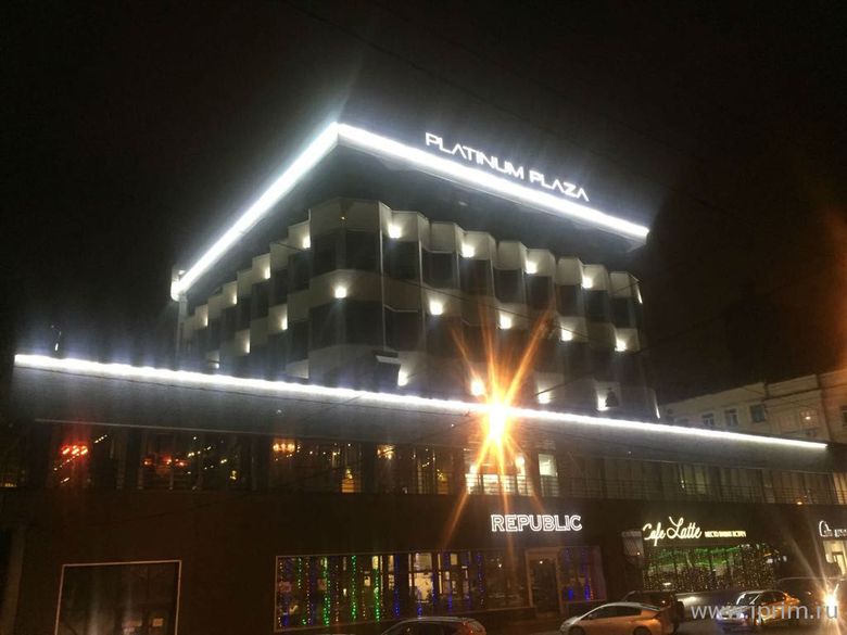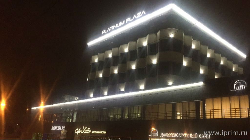 Компания "ПромАльпВл" закончила электромонтажные работы по оформлению светодиодной подсветкой здания с вывеской "Platinum Plaza" на ул. Светланская.