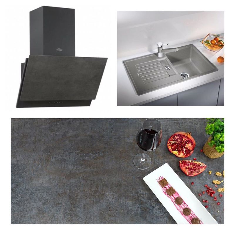 Компания "Мебельщик" предлагает вниманию покупателей серый комплект из раковины, вытяжки и столешницы.