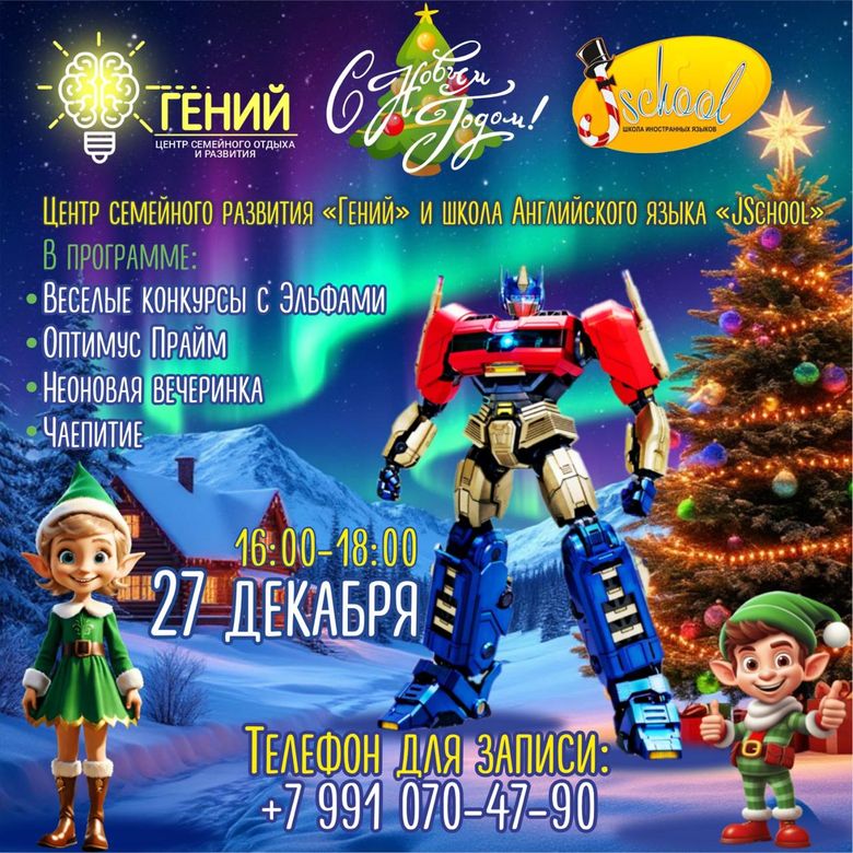 Приглашаем ваших детей окунуться в настоящую зимнюю сказку! Центр семейного развития "Гений" вместе с крутыми партнерами — Jschool и "РОБОТРЕК" — устраивает улетную вечеринку "Новогодний Калейдоскоп"! Подарите вашему ребенку незабываемые эмоции и заряд волшебства!