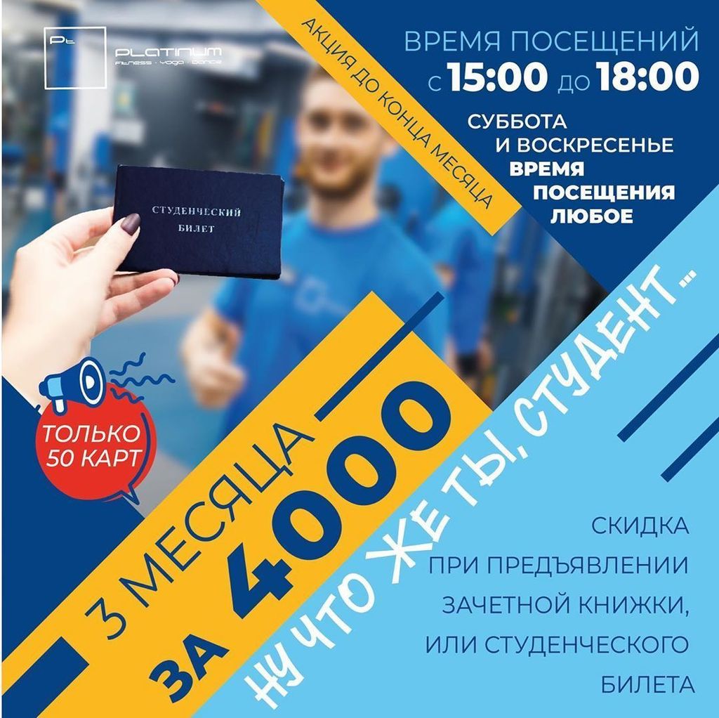 На новый учебный год, мы подготовили лучшее фитнес-предложение для вас, студенты и старшеклассники! 3 месяца занятий всего за 4000 рублей. Первая тренировка с инструктором в подарок.