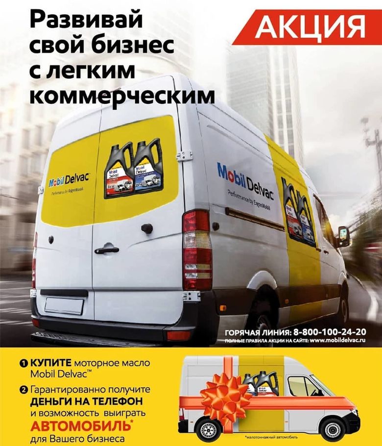 Покупайте моторное масло Mobil Delvac для лёгкого коммерческого транспорта и получайте деньги на телефон и возможность выиграть главный приз - малотоннажный автомобиль!
