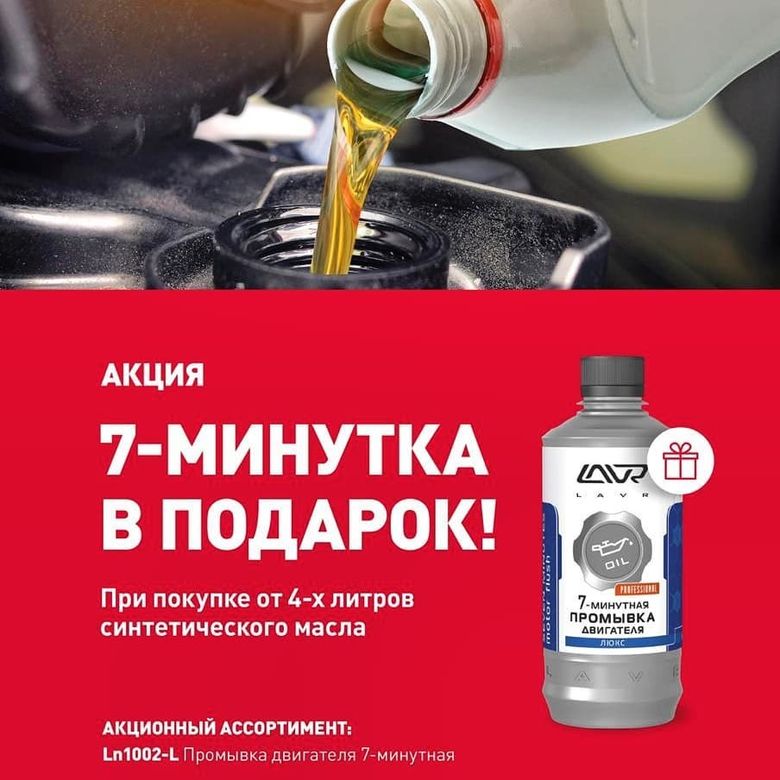 весь декабрь при покупке синтетического масла от 4 литров вы получаете 7-минутную промывку двигателя Ln1002-L бренда LAVR в подарок. А при покупке двух фильтров проведем замену масла в двигателе совершенно бесплатно!