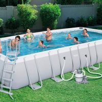 Каркасный прямоугольный бассейн Bestway 56466 выполнен из тех же материалов, что и предыдущие модели. Этот каркассный бассейн значительно больше - 549 см в длину, 274 см в ширину и 122 в высоту. Объем воды при заполнении на 90% - 11 532 литра. В комплекте с бассейном продаются фильтрующий песочный насос производительностью 5 678 л/ч., лестница для бассейна, тент, дозатор для химии, клапан для слива воды и ремкомплект. В настоящий момент Bestway 56466 участвует в акции и стоит всего 56 500 рублей. Стоимость модели без скидки - 62 080 рублей.