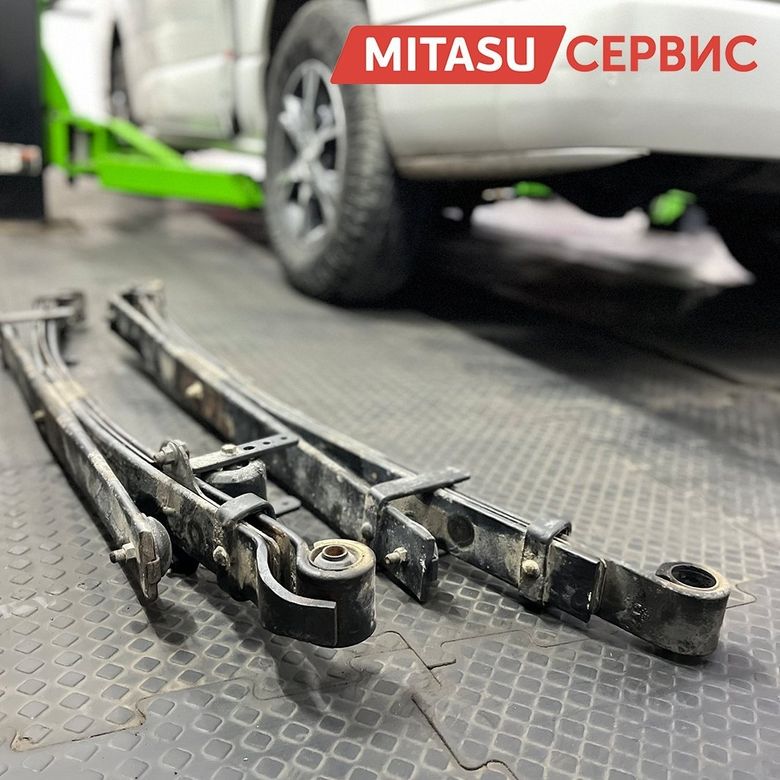 При осмотре специалисты "МитасуСервис" выявили, что сломан один из листов рессоры, поэтому было принято решение заменить их. Подобрали новые аналоги с другого кузова автомобиля. За счёт этого машина выровнялась и перестала проседать.