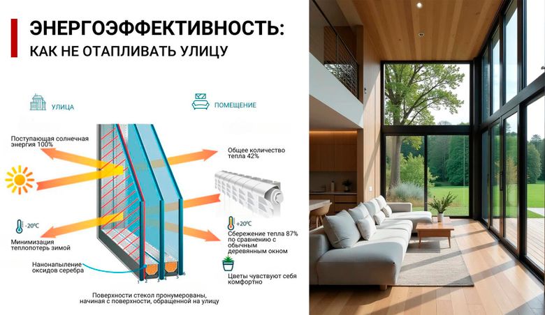 - Low-E стекла с напылением серебра — отражают 87% тепла обратно в комнату.