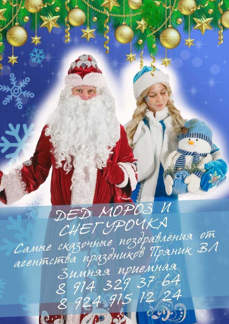 Вы хотите пригласить Деда Мороза и Снегурочку к себе на праздник? Нет ничего проще - наберите телефон нашей новогодней службы! Дед Мороз и Снегурочка приедут к вам в нарядных костюмах, проведут веселую новогоднюю программу, принесут в ваш дом удачу и создадут новогоднюю атмосферу.