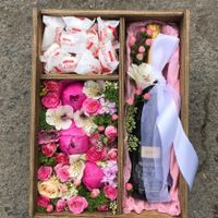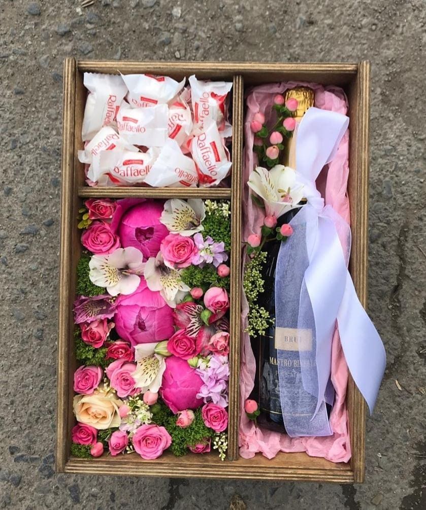 - коробку с цветами, шоколадом, ягодами, фруктами и вашим алкоголем,