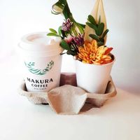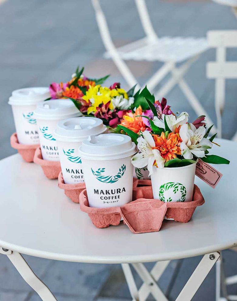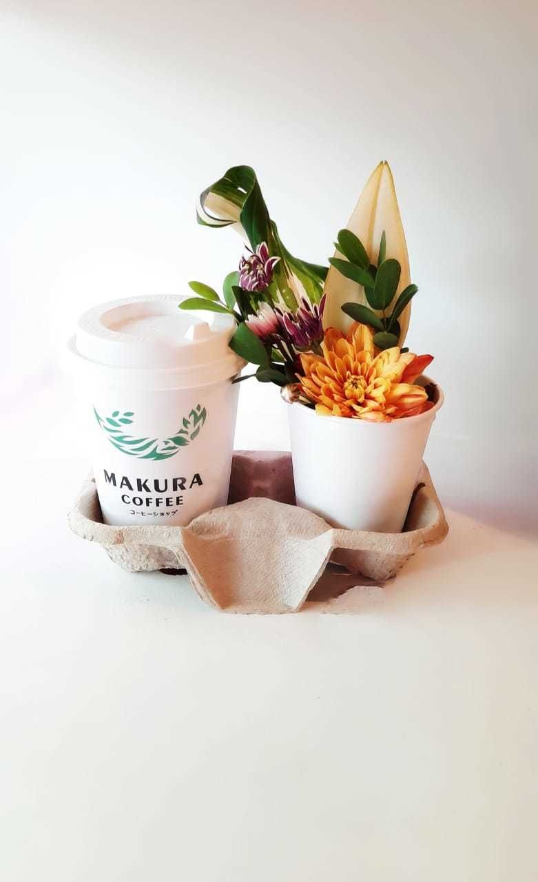 - скромный комплимент из цветов в кофейном одноразовом стаканчике,