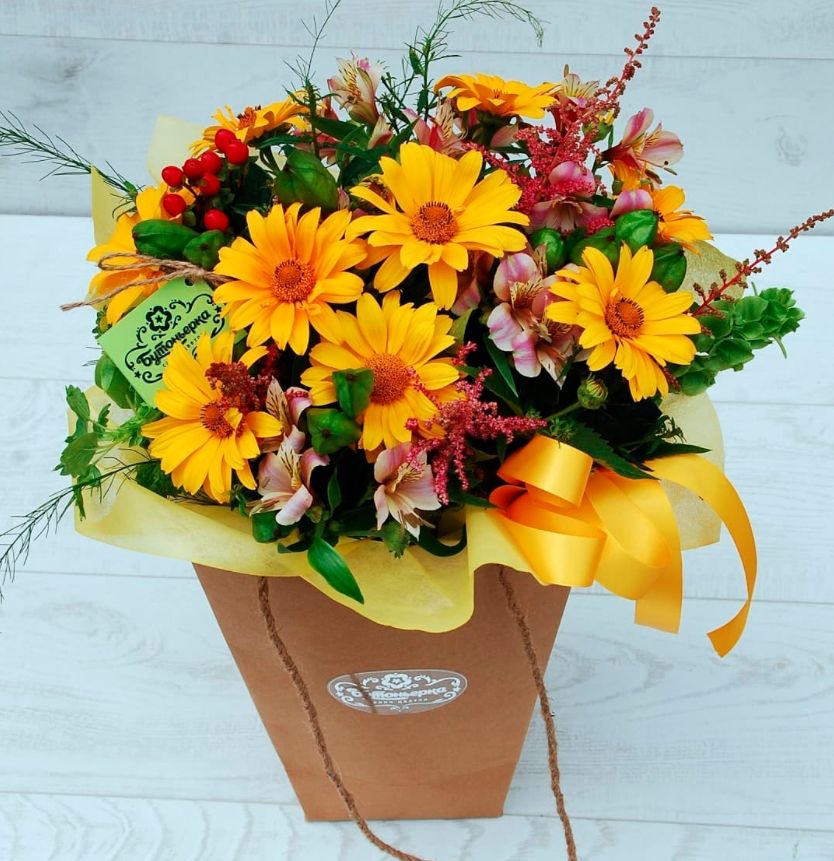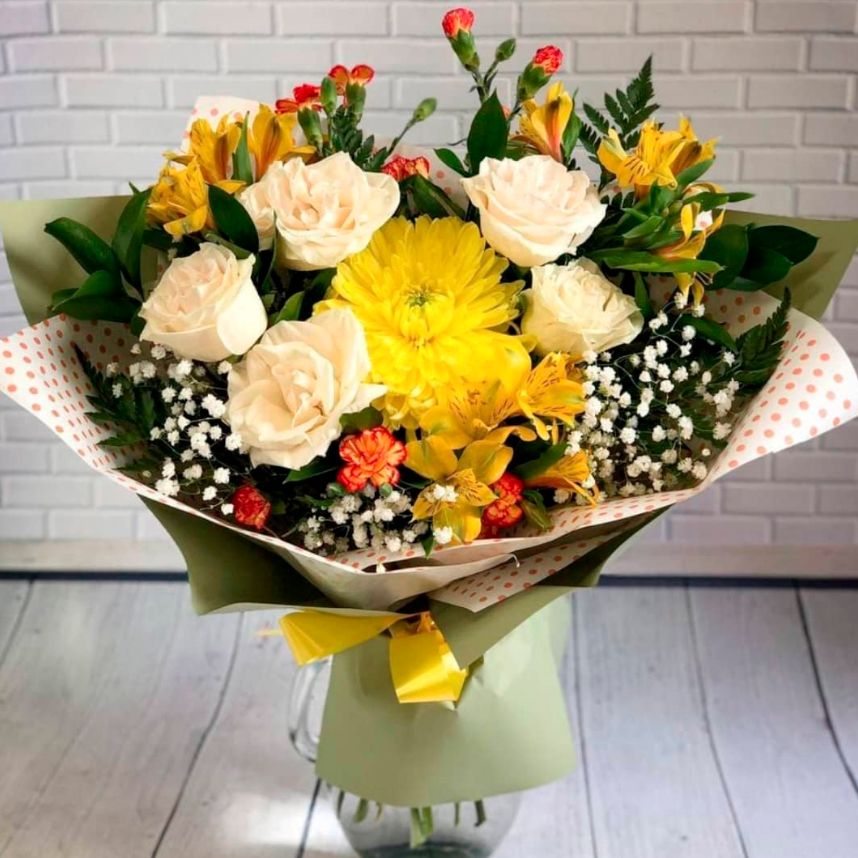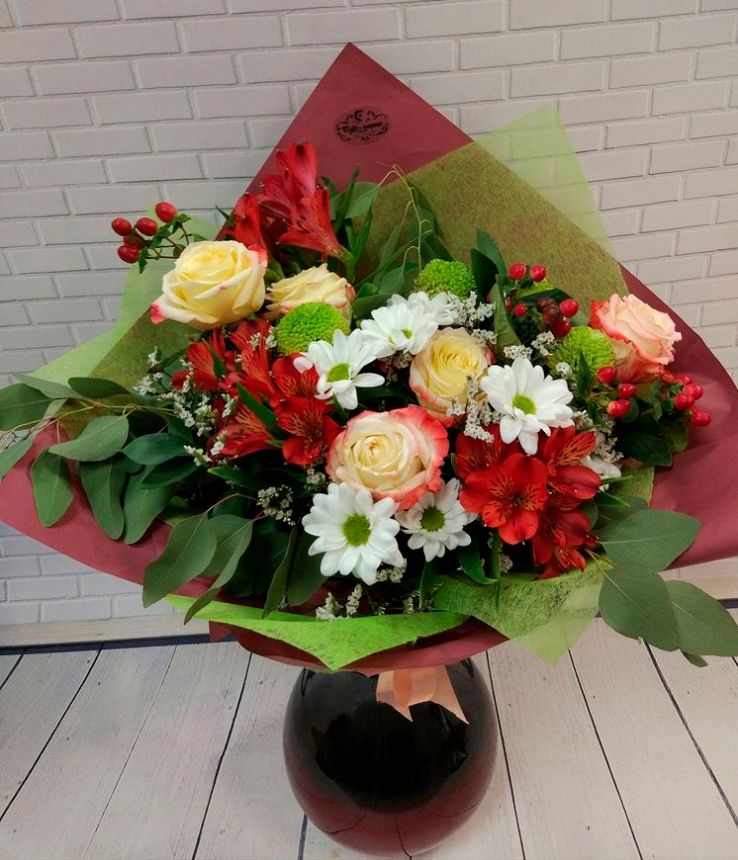 Не нравится получившаяся цветовая гамма? Шишки и еловые ветки кажутся лишними? Соберите свой собственный, индивидуальный букет из любых цветов, имеющихся в нашем ассортименте. На Ваш выбор ромашки, пионы, лилии, герберы, розы, хризантемы, тюльпаны, альстромерии и многие другие красавицы цветочного мира. Правило только одно: для долгой жизни букета важно соблюсти сочетаемость растений.