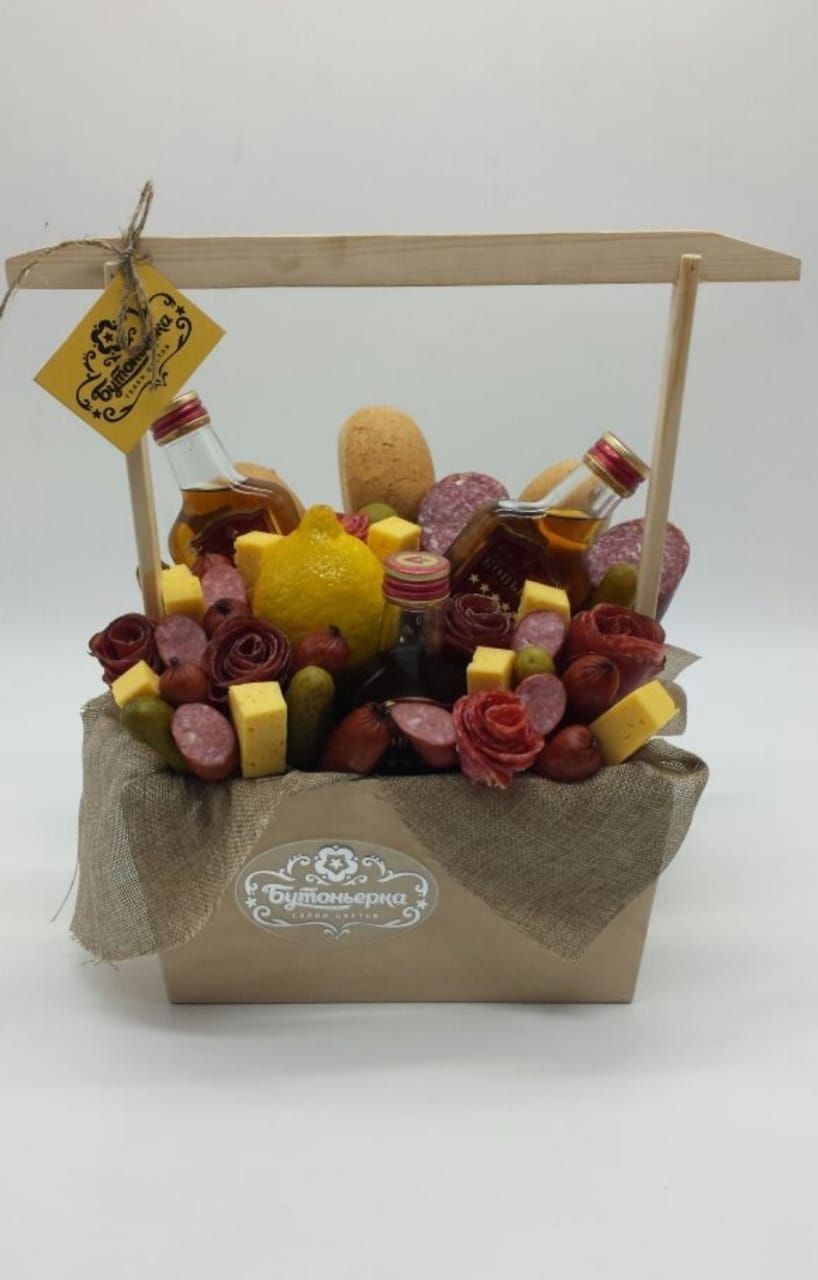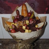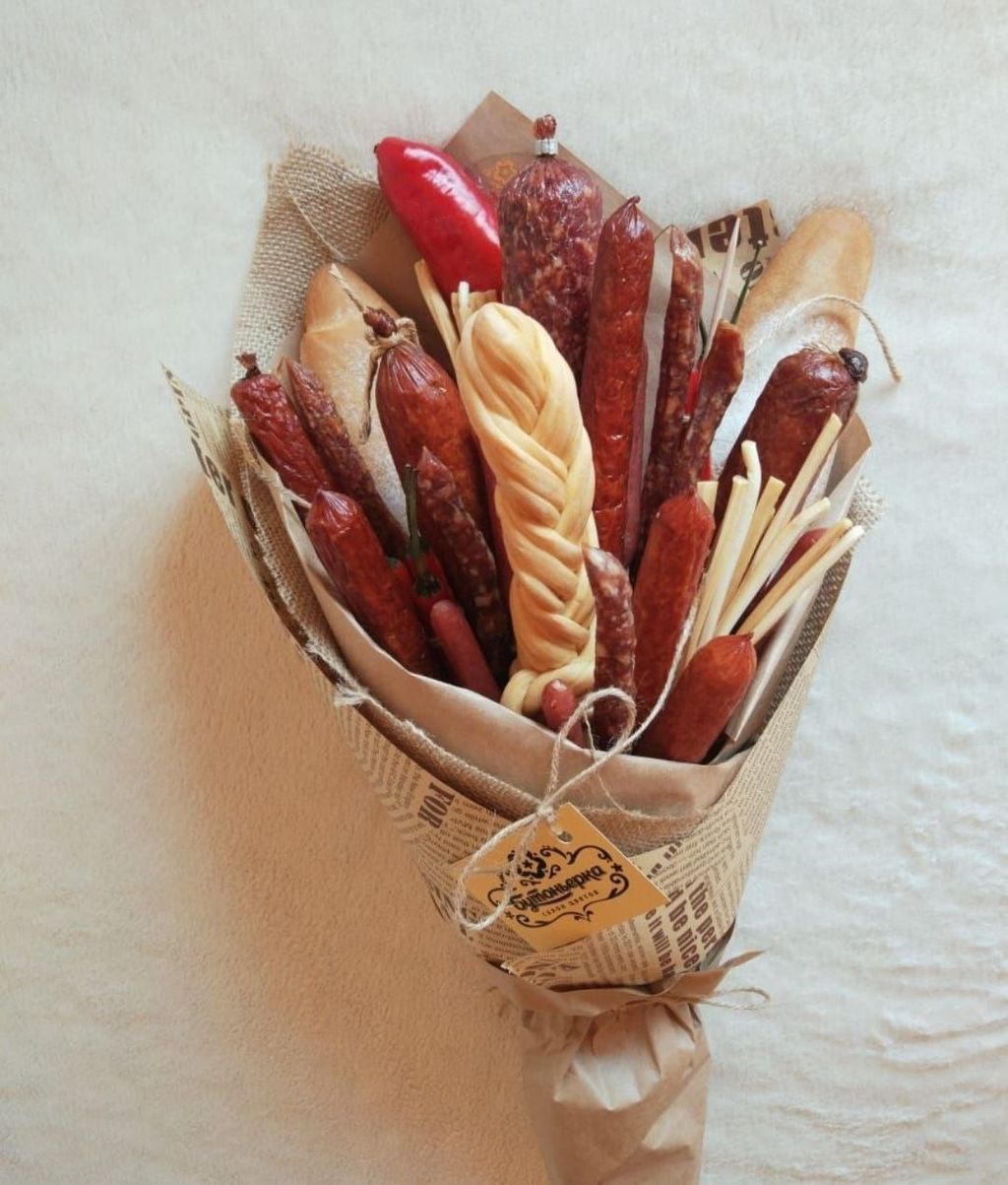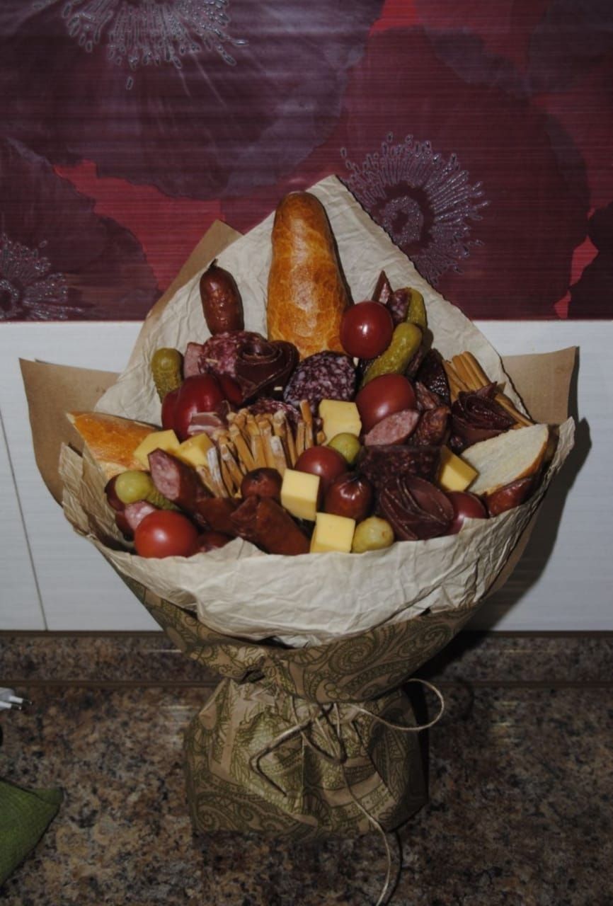 Однако наши мужчины цветами не избалованы и вместо радости в ответ на такой подарок есть шанс получить недоумение. Чтобы этого не случилось, используйте цветы исключительно как декор к настоящему букету, который принесет радость любому мужчине: букет из колбас и сыров, букет из орехов и цитрусовых, из пенного и закуски из морепродуктов. Звучит привлекательно?