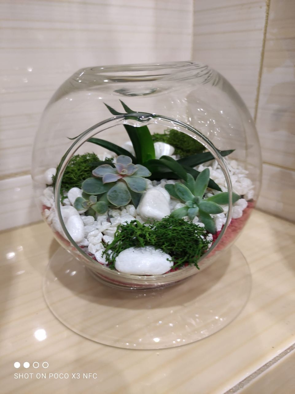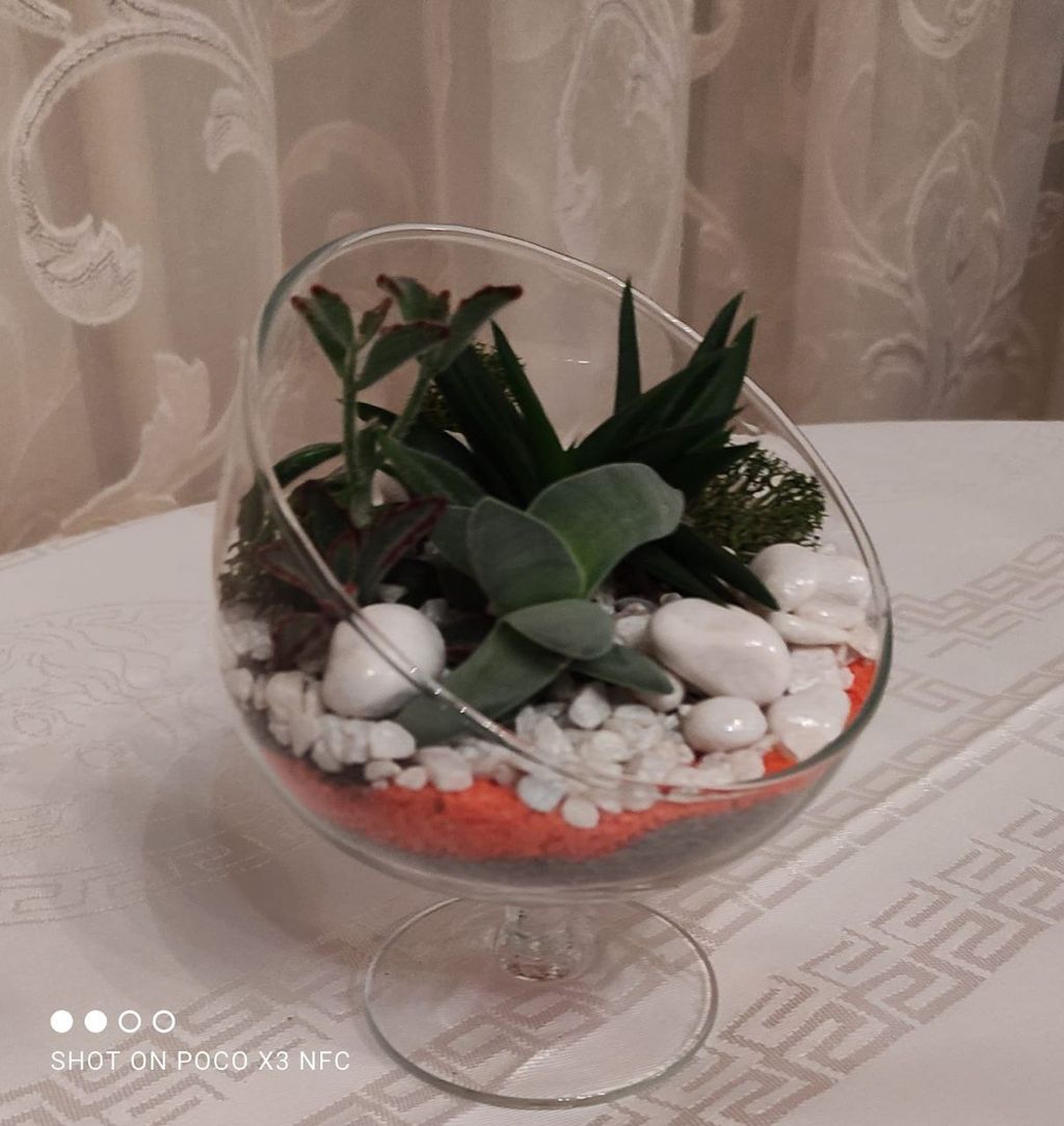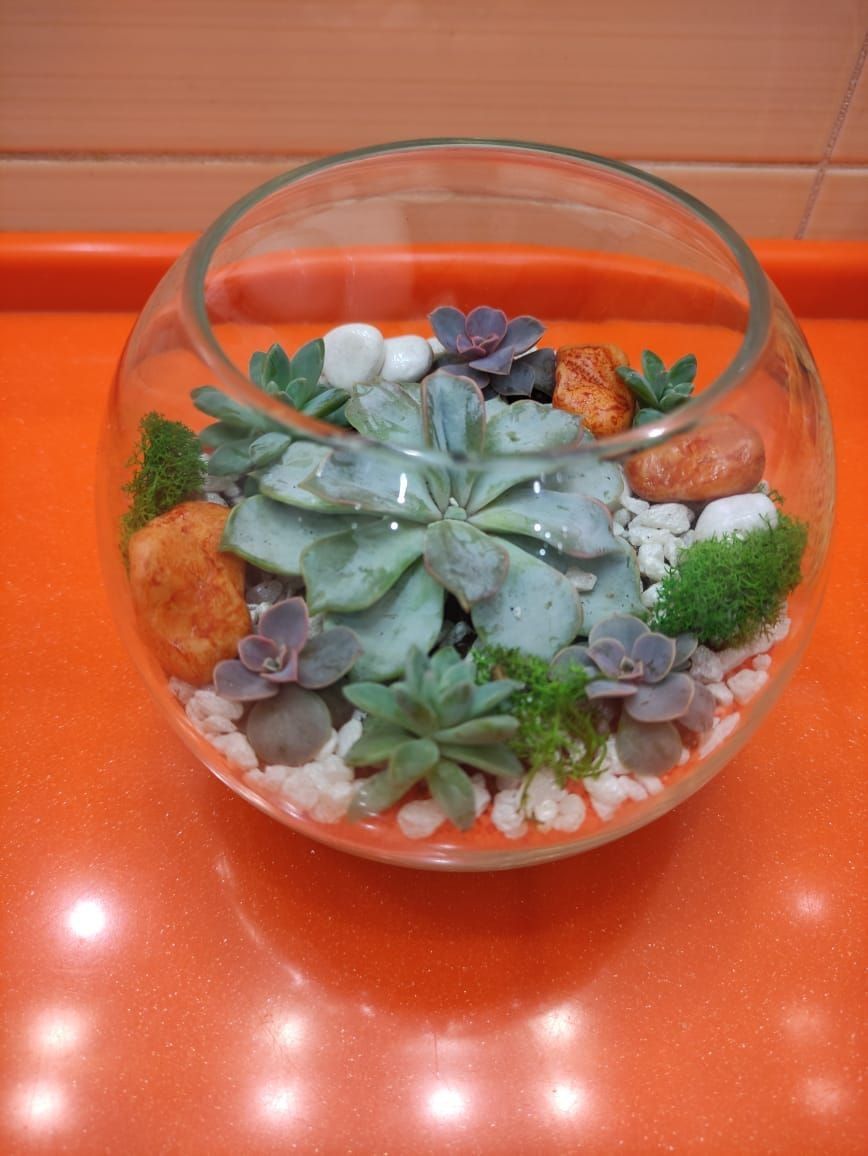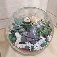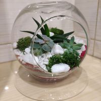 К суккулентам относятся кактусовые, толстянковые, агавовые, ластовненые, лилейные, молочайные и аизооновые растения. Оформление в изящные и минималистичные геометрические формы из стекла и металла, украшенные разноцветными камнями и песком, флорариумы легко впишутся в любой интерьер, благодаря возможности создания совершенно любой композиции.