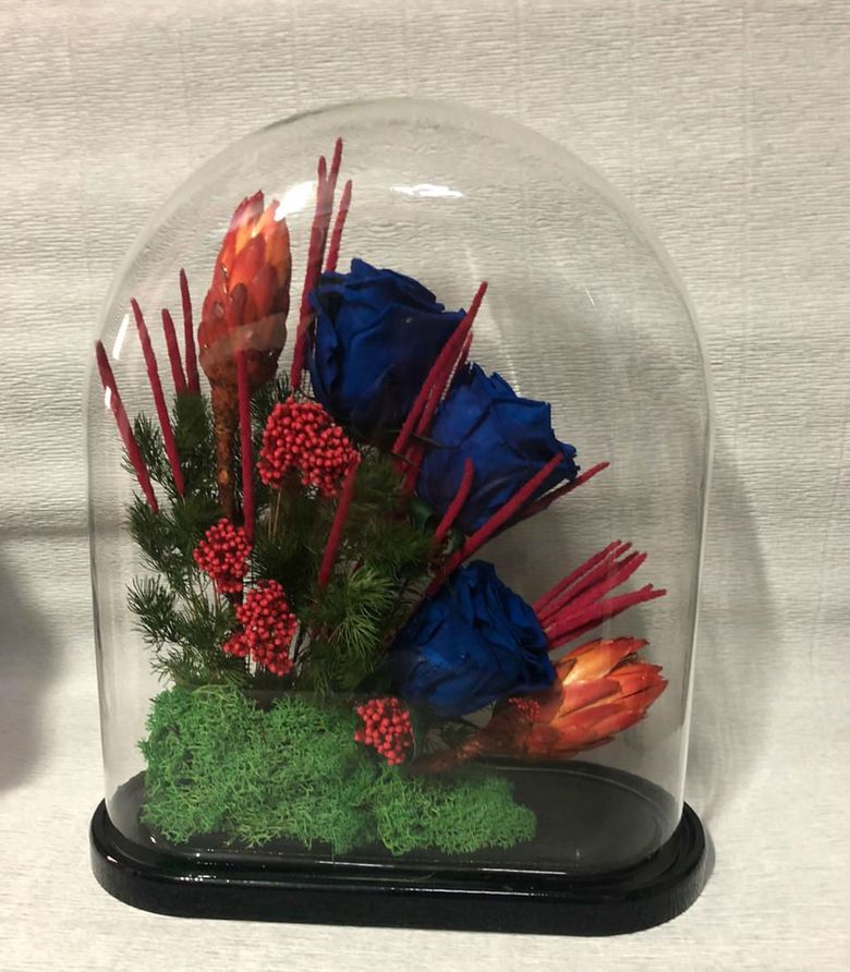 Стабилизированные цветы в вакуумном сосуде cмогут украшать дом по меньшей мере пять лет, а открытые композиции - около трёх. Сочетание благородных садовых цветов с мхом, лесными ягодами или злаковыми выглядит необычно и радует глаз. Вы можете заказать любую форму стеклянной колбы, даже экстравагантную - мы с радостью подберём необходимый вариант.