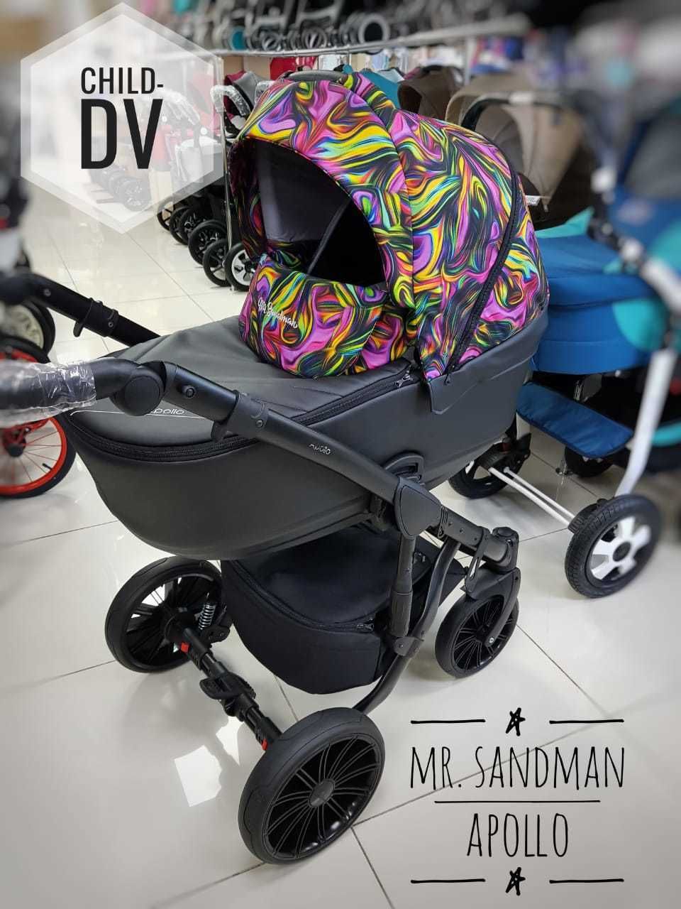Стильная коляска от Mr. Sandman - Apollo. Люлька имеет большой размер (80 х 32 см.) и в ней легко разместится младенец в зимнем комбинезоне и теплом конверте. В комплектацию коляски входит сумка-рюкзак для мамы, полиэтиленовый дождевик, москитная сетка, чехлы на колёса и матрасик для пеленания. Внутри люльки спрятался удобный кармашек для бутылочки, соски или других необходимых мелочей.