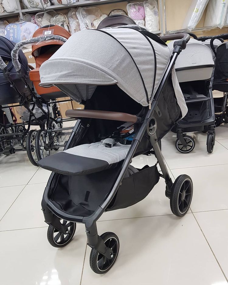 - Все колеса с амортизацией, что существенно влияет на комфорт ребенка во время прогулок.