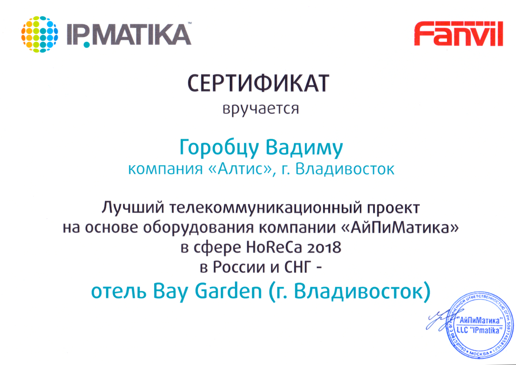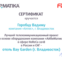Проект получил сертификат "Лучший телекоммуникационный проект в сфере HoReCa 2018".