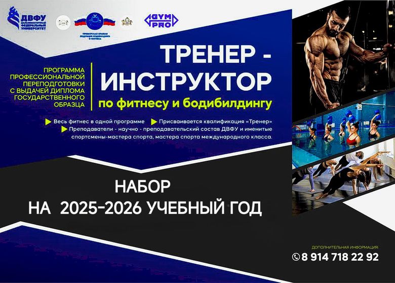 Приморская краевая федерация бодибилдинга ведет набор на курс профпереподготовки по специальности "Тренер-инструктор по фитнесу и бодибилдингу" с выдачей диплома государственного образца и присвоением квалификации "тренер".