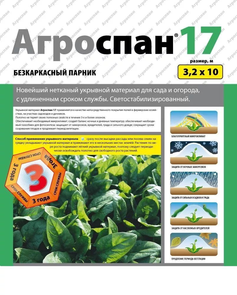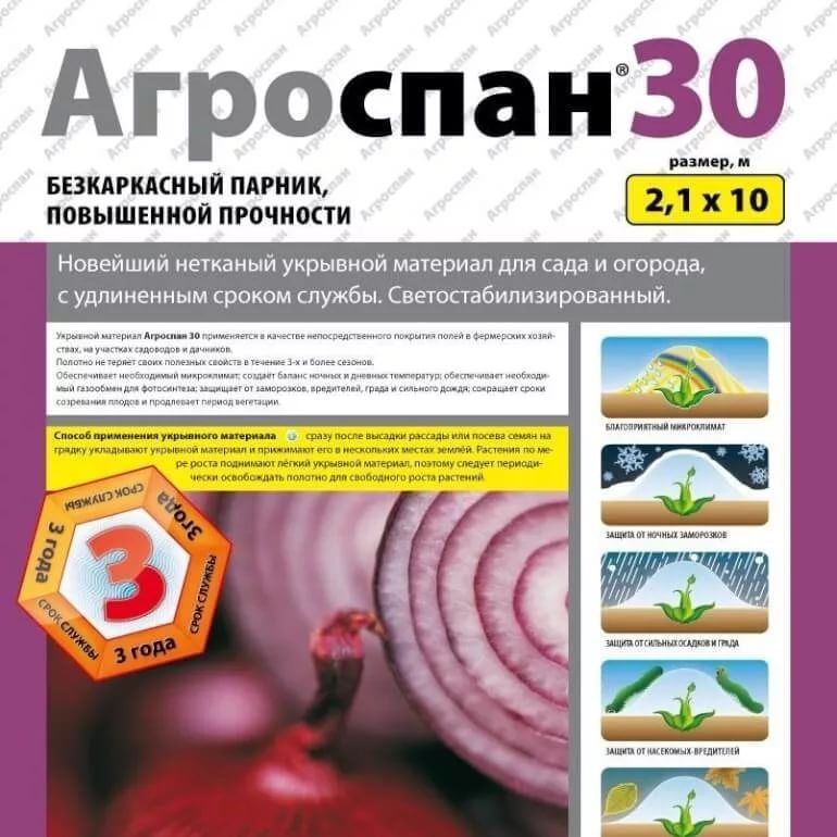 Срок службы материала "Агро Спанбонд СУФ" достигает трех лет. Материал устойчив к УФ-излучению, защищает растения от солнца, ветра, града и даже заморозков до -5°С.