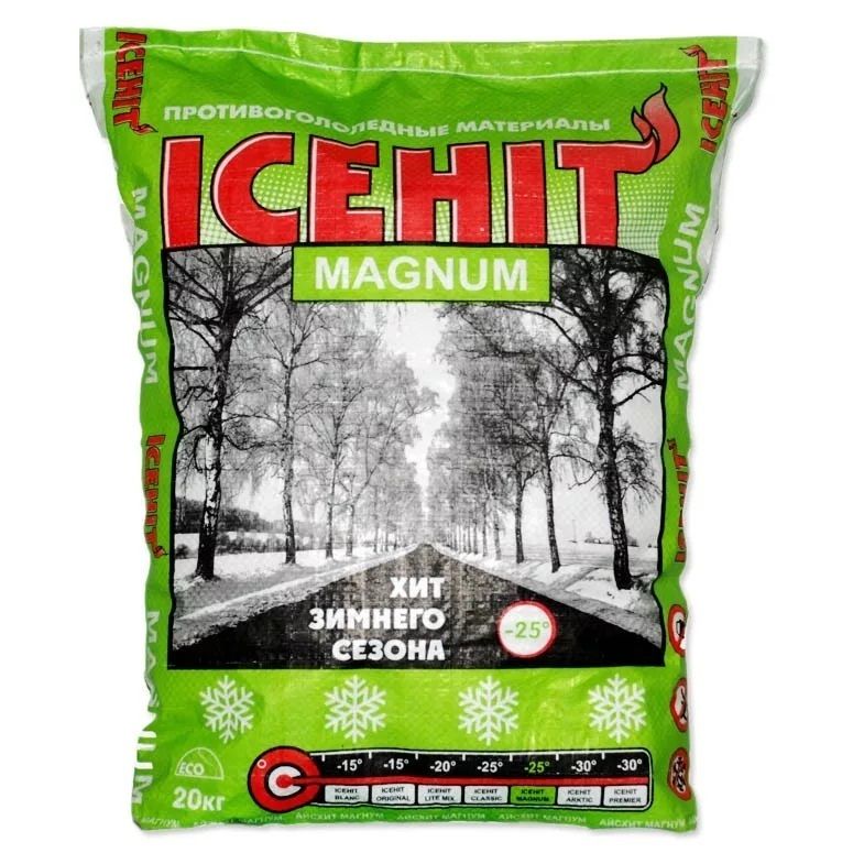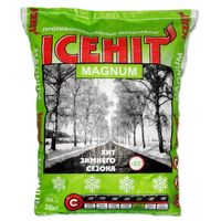 - Антигололедная смесь IceHIT Magnum в мешках по 20 кг. В составе: натрия хлорид, хлорид магния, ингибитор коррозии. Подходит для использования при температурах от 0 до -31 градусов.