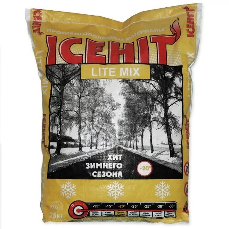 - Антигололедная смесь IceHIT Lite Mix в мешках по 25 кг. В составе: натрия хлорид, хлорид кальция, ингибитор коррозии. Подходит для использования при температурах от 0 до -25 градусов.