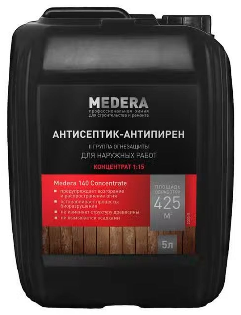 Огнебиозащита, 2-я группа огнезащиты, Medera 140 концентрат 1:15. Огнезащита 2-й группы, для защиты эксплуатируемой на открытом воздухе древесины, а так же деревянных элементов нежилых помещений, от биопоражения, воздействия влаги и возгорания на срок до 20 лет. Для обработки стен, балок, несущих брусьев, перекрытий, лагов, стропил, оконных и дверных блоков, заборов и др. Применимо как покрытие и как грунтовка под любые пленкообразующие составы. Применимо для снижения усушечного растрескивания пиломатериалов.