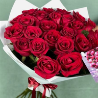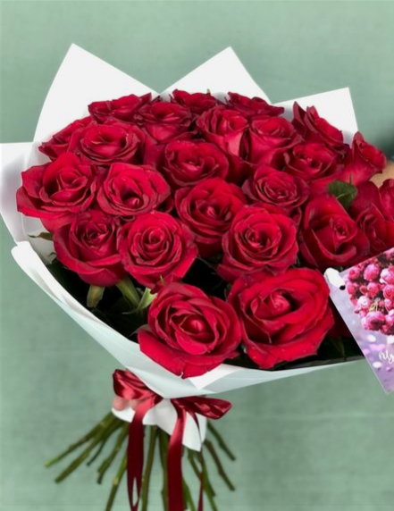 На фото представлен изготовленный нашими талантливыми мастерами букет красных роз. Стоимость 4 990 рублей за 25 роз.