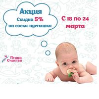 Дорогие подписчики! В магазинах Птица Счастья проходит недельная акция на соскипустышки! Акция продлится по 24 марта. Скидки по карте не...