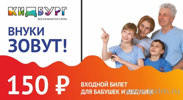 С 1 по 28 февраля бабушки и дедушки, которые сопровождают ребёнка в «КидБург», смогут приобрести взрослый билет всего за 150 рублей при предъявлении пенсионного удостоверения, справки, подтверждающей статус пенсионера, или паспорта!