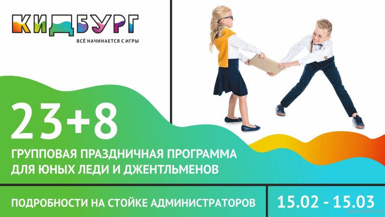 Приходите в Кидбург, и мы незабываемо отметим эти события ВМЕСТЕ: и мальчишки, и девчонки. И даже успеем сделать друг другу подарки! Даты проведения праздничной программы: 15 февраля – 15 марта