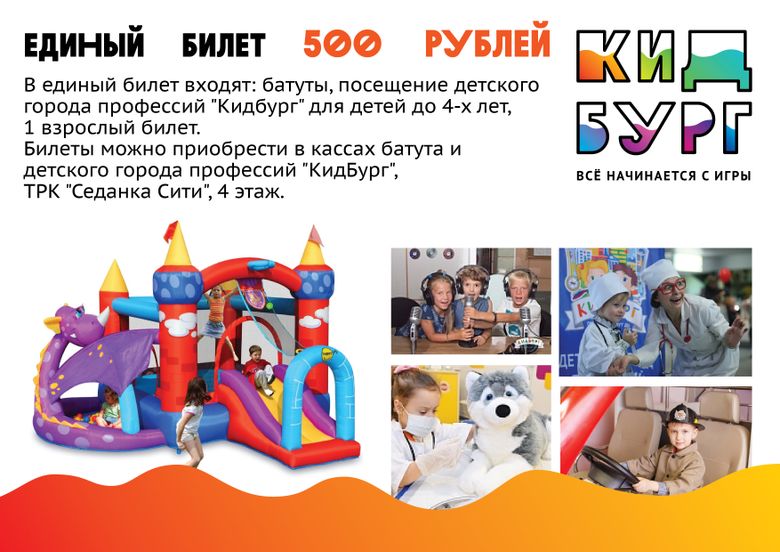Также напоминаем всем жителям и гостям нашего города о продаже ЕДИНОГО БИЛЕТА для детей до 4 лет. Единый билет в батутный центр на 4 этаже ТРК Седанка Сити и в детский город профессий КидБург.