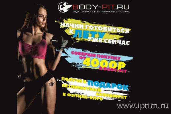 Уважаемые покупатели! Предлагаем начать готовиться к лету уже сейчас вместе с магазином спортивного питания "Боди-пит"! Как же это сделать? Все просто: при покупке продукции на сумму от 4 000 рублей магазин "Боди-пит" дарит безлимитный абонемент на месяц в фитнес клуб!